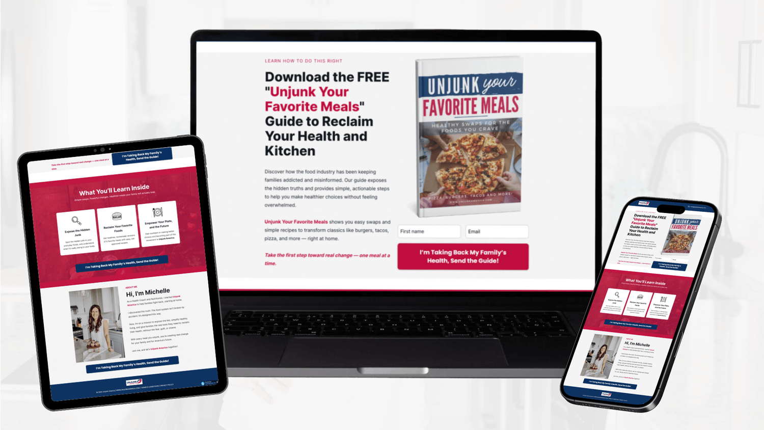 It hooks interest by showing that burgers, pizza, pasta, and other favorites can still be delicious without all the processed junk. By offering a free, beautifully designed recipe guide, it delivers instant value, builds trust, and sparks curiosity about other Unjunk America resources, paving the way for deeper engagement and future offers.